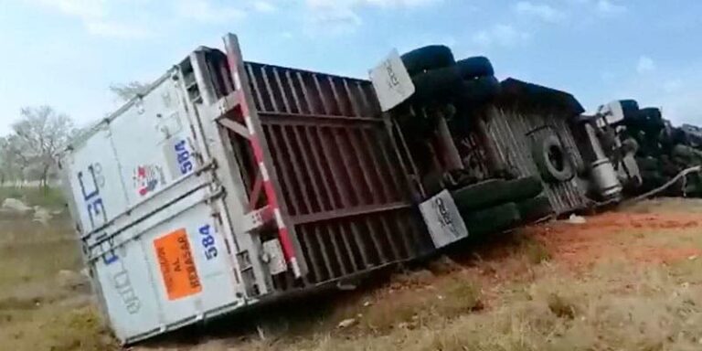 La pesada unidad, llevaba al menos 23 toneladas de carnes, proveniente de Monterrey, volcó esta mañana, en la bajada del ‘caracol’ que une la carretera Mérida Campeche con el Periférico de Mérida, al sur de la capital yucateca.
