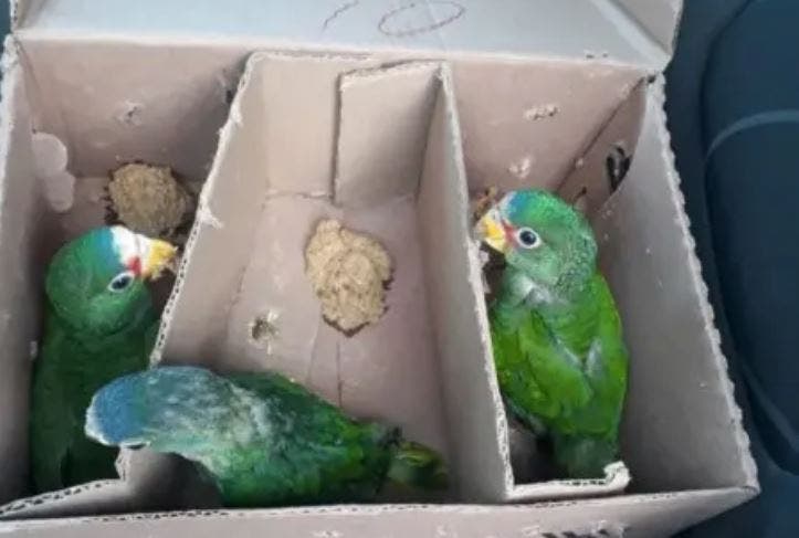 Durante la revisión, los uniformados se percataron que el copiloto llevaba entre los pies una caja, por lo que de inmediato cuestionaron que era lo que traía dentro y estos respondieron que “pollitos”, así fue como pidieron entregar la caja e hicieron el hallazgo de cinco loritos, aves que se encuentran en peligro de extinción.