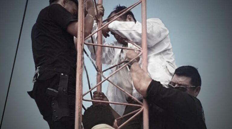 Siendo casi las dos de la tarde, las autoridades recibieron el reporte a los números de emergencia y enseguida acudieron a la ubicación antes mencionada, para tratar de rescatar al doctor el cual seguía colgando desde la torre.