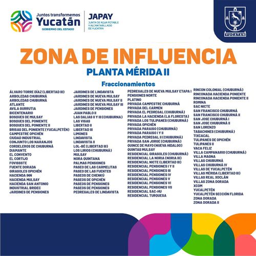 La Junta de Agua Potable y Alcantarillado de Yucatán (Japay), anunció que colonias y fraccionamientos del poniente y sur-poniente de Mérida se quedarán sin el servicio de agua potable a partir de las 12:00 horas hasta las 18:00 horas ante las reparaciones de un ducto de 30 pulgadas, ubicado en la carretera Mérida-Umán sobre la salida de incorporación al km 0+100 del Anillo Periférico de la ciudad.