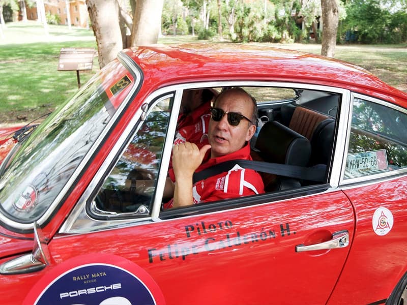El ex presidente Felipe Calderón Hinojosa, se «bajó» del Porsche Rojo número 60 y cedió su lugar a Jesús Salgado en la segunda etapa del Rally Maya México de autos antiguos que arrancó esta mañana de Mérida.