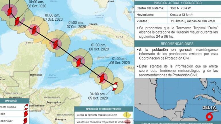 Así que la tormenta Tropical “Delta”, se intensificó a Huracán Categoría 1, se localiza a 245 km al sur-suroeste de Negril, Jamaica, y a 973 km al sureste de Yucatán; y se desplaza hacia el oeste a una velocidad de 13 km/h con vientos de 120 km/h y rachas de 138 km/h. Se espera un movimiento más rápido al noroeste entre el martes y miércoles por la noche.