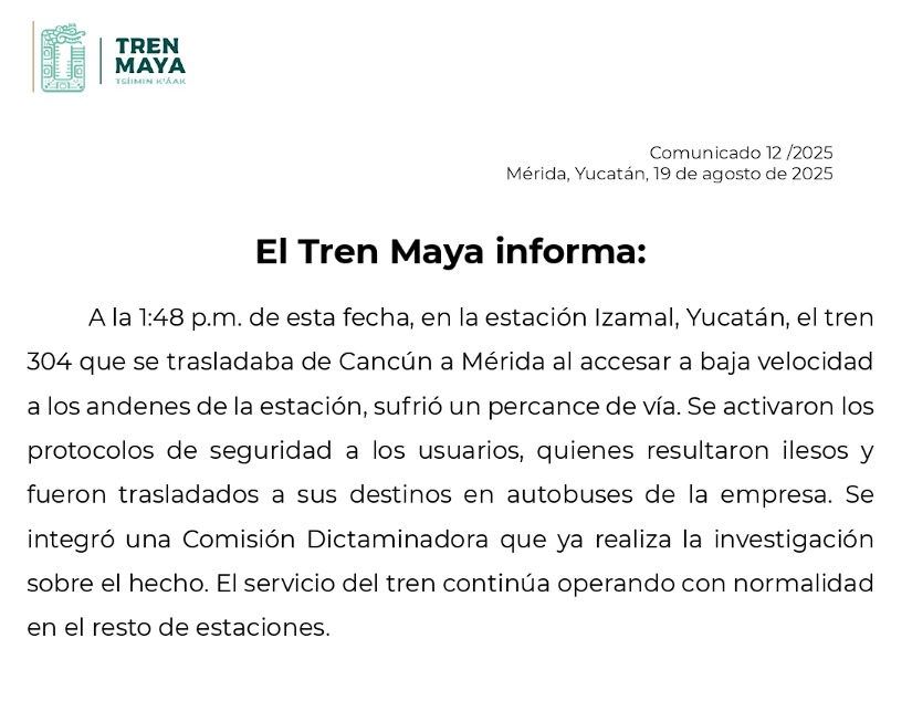 ACTUALIZACION: La directiva del Tren Maya, informó mediante un comunicadom oficial difundido en sus redes sociales que el incidente ocurrió a la 1:48 p.m. en la estación Izamal, Yucatán, trtándose del tren 304 que se trasladaba de Cancún a Mérida, y que al accesar a los andenes de la estación a baja velocidad sufrió un percance de vía.