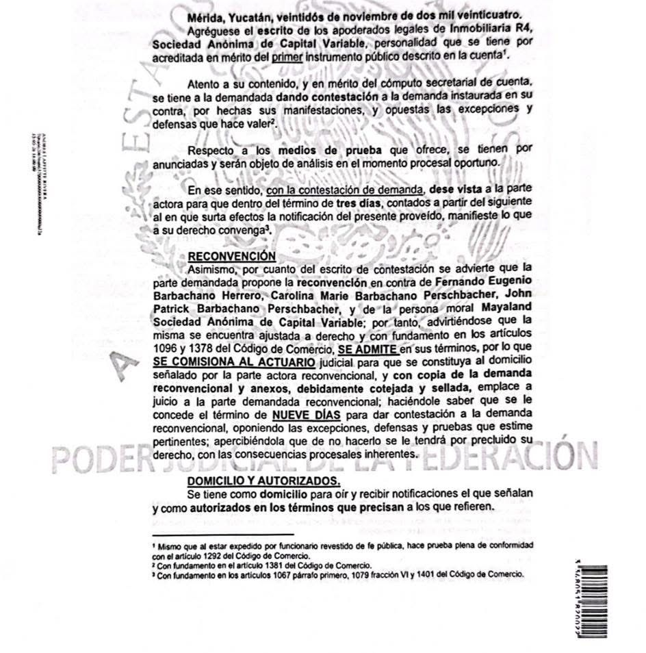 “Inmobiliaria R4 no caerá en provocaciones ni responderá los insultos de Barbachano Herrero. Continuaremos con el proceso judicial hasta sus últimas instancias, siempre apegados a las leyes y confiados en que se impartirá justicia”, concluyó Matos López.