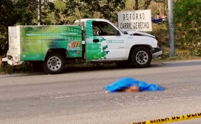 De acuerdo con la información preliminar, una mujer murió atropellada cuando intentaba cruzar el Periférico de Mérida, a la altura del kilómetro 5+500, cerca del puente de la avenida 86, a la salida de Dzununcán, cuando en un momento dado una camioneta de la CFE que era conducido por su personal la impactó hasta aventarla 15 metros del lugar del que intentaba cruzar.