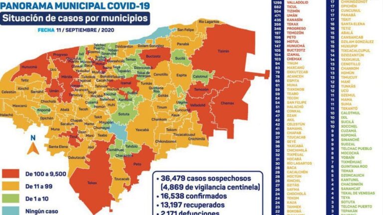 Los municipios con mayor número de contagios son Mérida con 9,084 casos, Valladolid con 1,283, Ticul con 677, Tizimín con 495, Umán con 466, Kanasín con 435, Tekax con 354, Progreso con 345 casos, Temozón con 194 y Peto con 156 casos positivos.