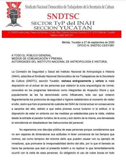 Al parecer, en el documento se explica que los “influencers” no respetaron las medidas del lugar, no usaban cubrebocas, no guardaban la sana distancia, dejaron basura en la zona y gritaron y amenazaron al personal del sitio.