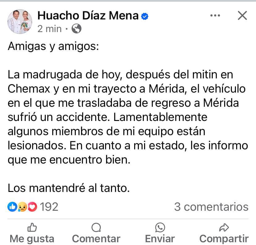 “La madrugada de hoy, después del mitin en Chemax y en mi trayecto a Mérida, el vehículo en el que me trasladaba sufrió un accidente. Lamentablemente, algunos miembros de mi equipo están lesionados. En cuanto a mi estado, les informo que me encuentro bien”, refirió el candidato.