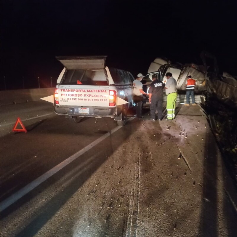 La volcadura de un camión que transportaba material explosivo provocó la mañana de este lunes el cierre momentáneo de la autopista Mérida–Cancún, a la altura del kilómetro 206, en lo que se desarrollaban las maniobras especializadas en la zona.