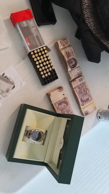 En una mochila trasladaba tres fajos de billetes de 500 pesos mexicanos, un estuche con un reloj de lujo y una caja con diversos cartuchos útiles.